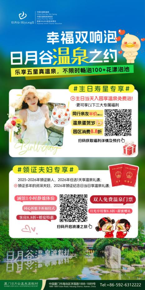 温馨提示:新婚礼遇、纪念日礼遇、生日福利每日开放席位有限,需通过官方商城提前预约成功方可享受。赴一场日月谷的暖泉之约吧!让牵手一生的浪漫承诺、岁月沉淀的相守深情,或是岁岁年年的生辰欢喜、夜幕下的温柔治愈,都能在此找到最熨帖的回应。